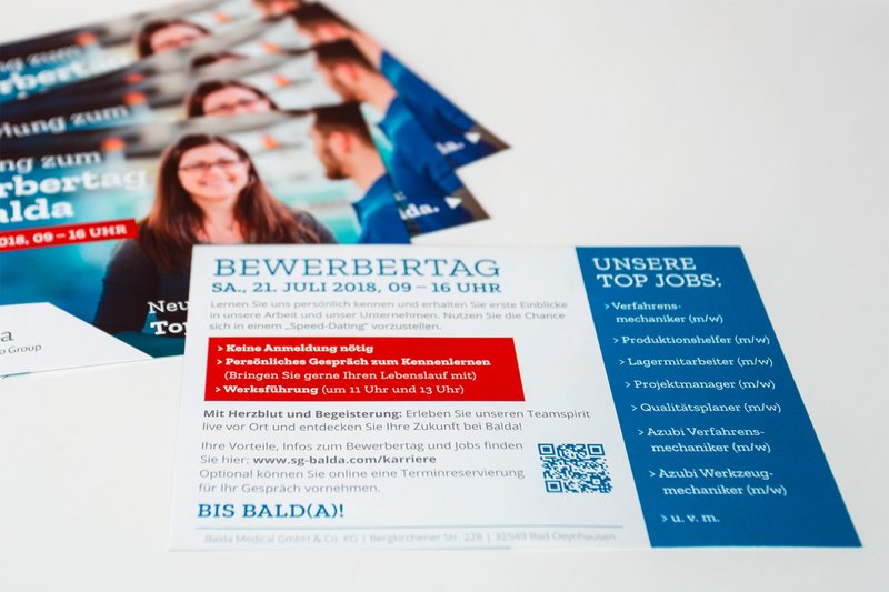 Die bwc erstellte mit innovativen und frischen Ideen ein Konzept für die Umsetzung der Personalrekrutierung. Neben Großflächenplakaten im Raum Bad Oeynhausen und Umgebung, lud eine TipOn Card auf der Titelseite der Neuen Westfälischen zum Höhepunkt der Kampagne – dem Bewerbertag bei Balda am 21. Juli 2018 – ein. Als Infomaterial für Bewerber wurde eine 16-seitige Recruiting-Broschüre gestaltet. Online Anzeigen in den gängigen Job-Plattformen der Neuen Westfälischen ergänzten die Möglichkeiten sich bei Balda zu bewerben auf zusätzlichem Weg.